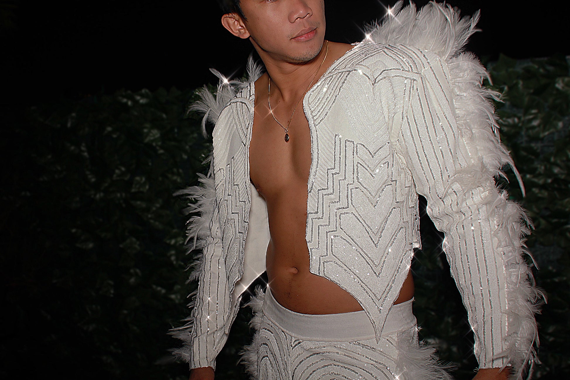 Non-Stretch Open chest Feathery Trim sequin jacket with complimentary Stretch Feathery Trim Pants.